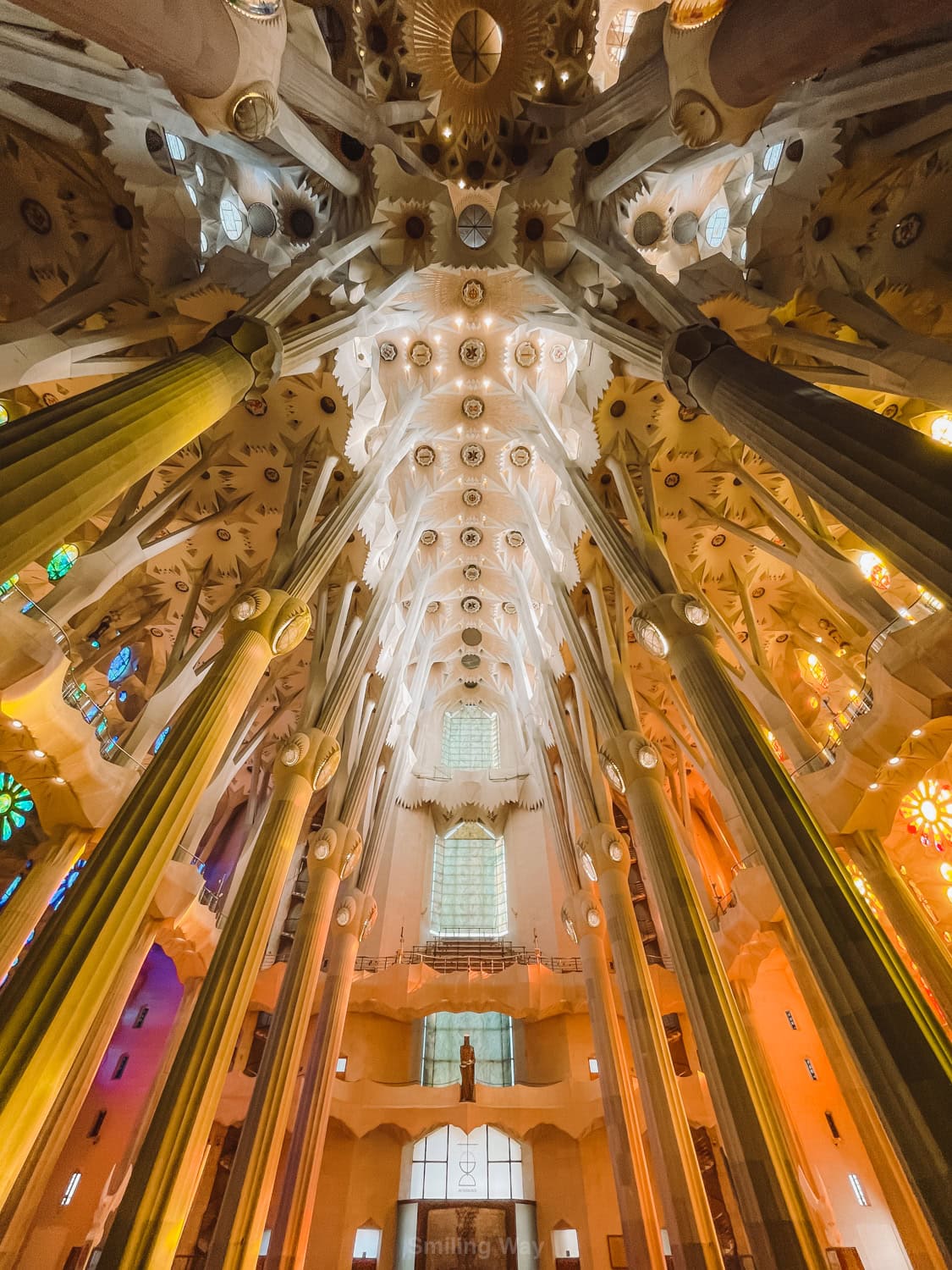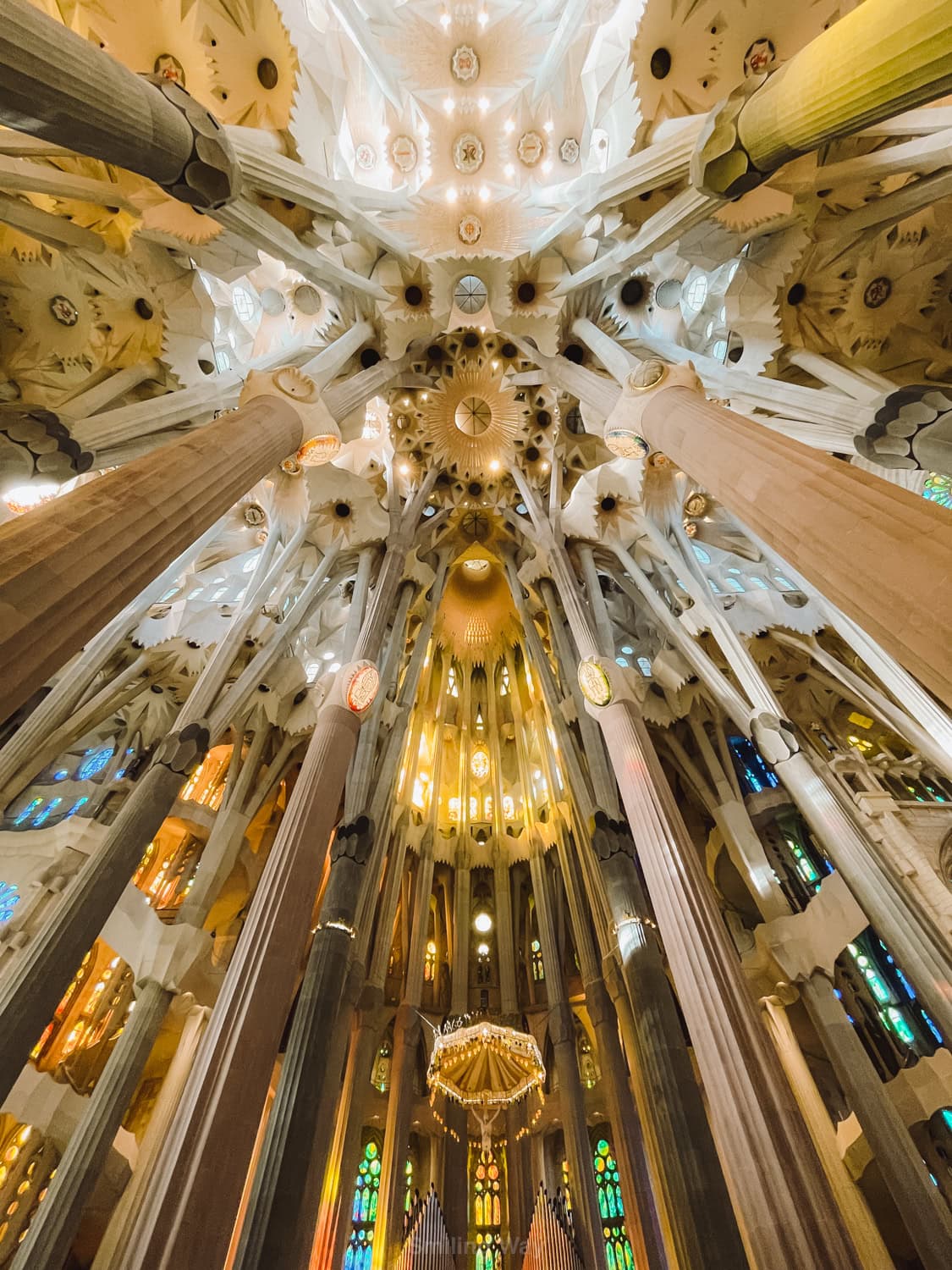 Gaudí navrhl interiér tak, aby připomínal les. Sloupy se u stropu větví jako stromy a vytvářejí klenbu, která působí, jako byste stáli pod korunami obrovských listnatců.