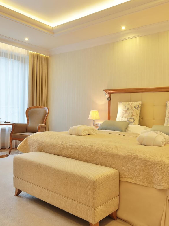 Hotel funguje od roku 1701 a leží přímo v lázních jen pár kroků od kolonády. Interiéry pokojů působí elegantně – stropní fresky, křišťálové lustry a některé mají balkon s výhledem na řeku Teplá.